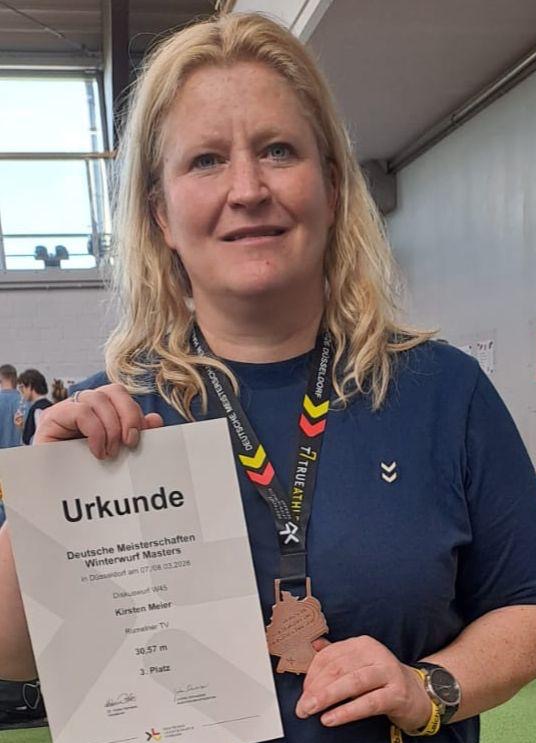 Zum Abschluss der Hallen-/ Winterwurfsaison ging unsere Seniorin Kirsten Meier noch zweimal an den Start. Bei den Landesmeisterschaften Ende Februar in Düsseldorf freute sie sich im Kugelstoßen über eine persönliche Bestleistung und Rang 2. Ihren geliebten Diskuswurf beendete sie trotz einsetzendem Regen und nassem, rutschigen Ring mit der Goldmedaille und dem Titel in der Altersklasse W45. Nur 2 Wochen später kehrte sie zu den Deutschen Meisterschaften nach Düsseldorf zurück. Bei strahlendem Sonnenschein und milden Temperaturen fand sie schnell in den Wettkampf, da der glatte Diskusring ja bekannt war. Im 3. Versuch beschleunigte sie ihren Diskus mit einer mutigen Drehung und belohnte sich mit einer Saisonbestweite von 30,57m und der Bronzemedaille. Herzlichen Glückwunsch!